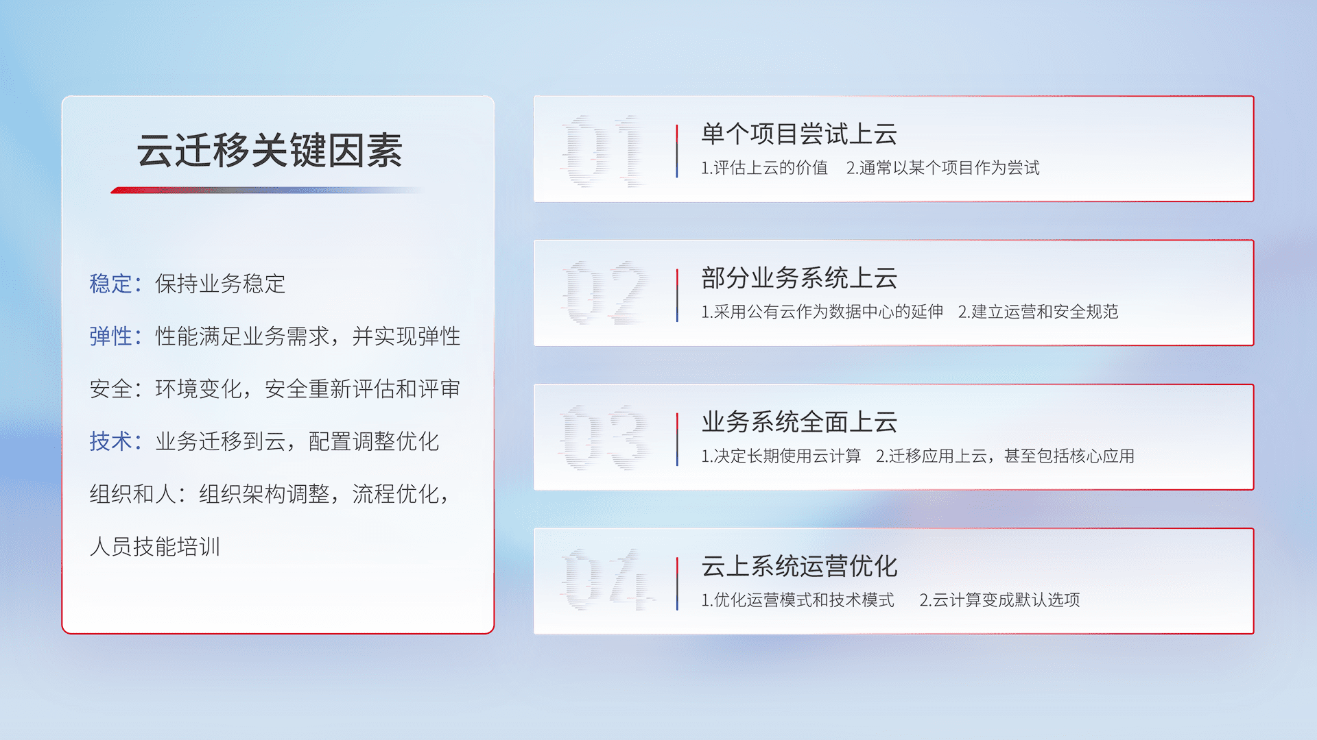 结合实际业务,,,,从规划设计、、云平台选型、、云原生改造、、数据迁移、、集成交付,,,,迁移全过程为客户识别最佳上云路径,,做好风险识别管理,,,,设计网络架构、、、、身份权限、、、安全审计合规、、、、操作审计、、、日志审计、、、、监控告警策略、、多站点容灾设计等,,对云上基础设施进行整体规划,,,,提升IT治理水平,,以满足弹性、、高可用、、、高性能的需求。。。。